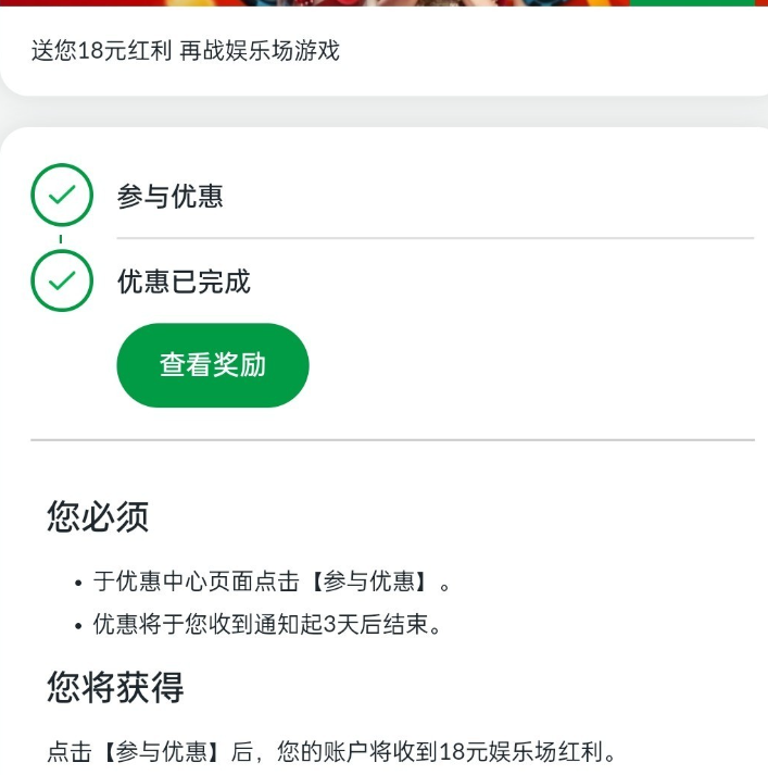 优惠中心页面点击参与优惠送18元回馈彩金