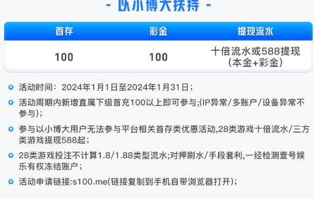 首存100送100  不限制游戏(最低盈利588方可提现 或者 本金+彩金满足10倍流水以上即可提现)首存活动只能参加一个,参加100+100 其他首存活动都无法参与。