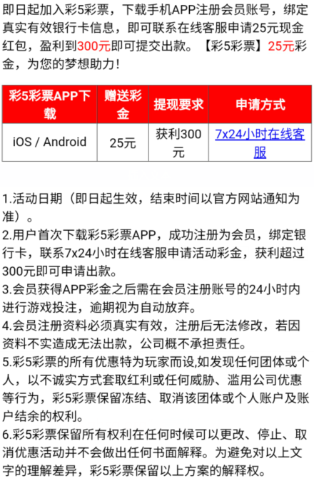 活动详情:注册下载app绑定银行卡找在线客服申请25彩金/300t