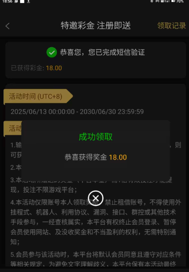 活动详情:短信特邀彩金